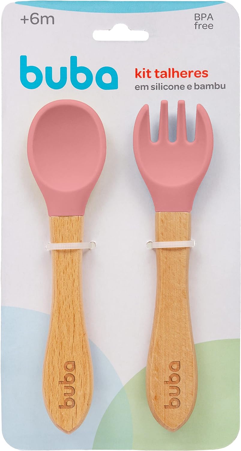 Possui um garfo e uma colher com ponta macia e flexível, ideal para as gengivas sensíveis do bebê, e cabo em bambu, que é super leve.