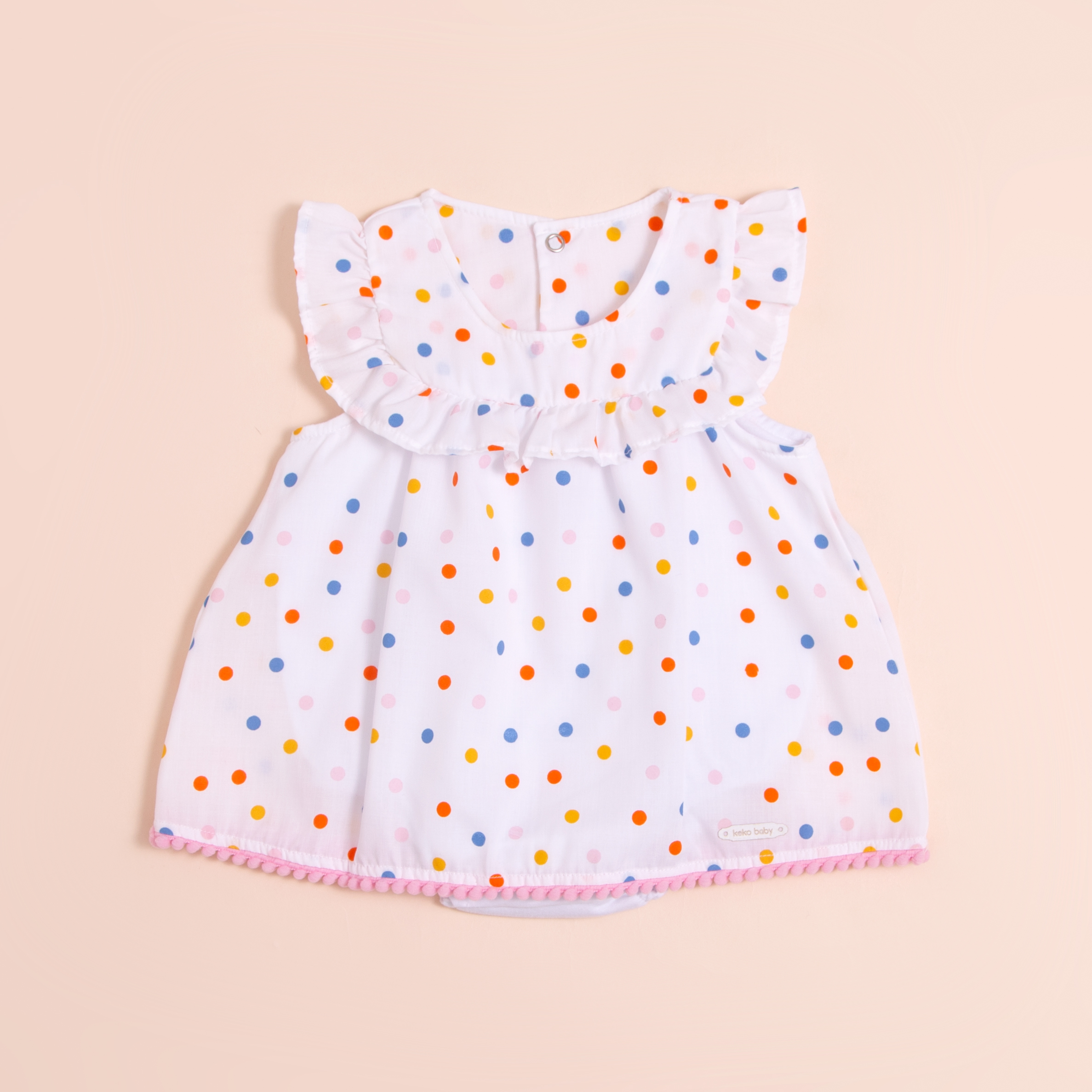 Vestido em tricoline com calcinha em meia malha já costurada no próprio vestido.